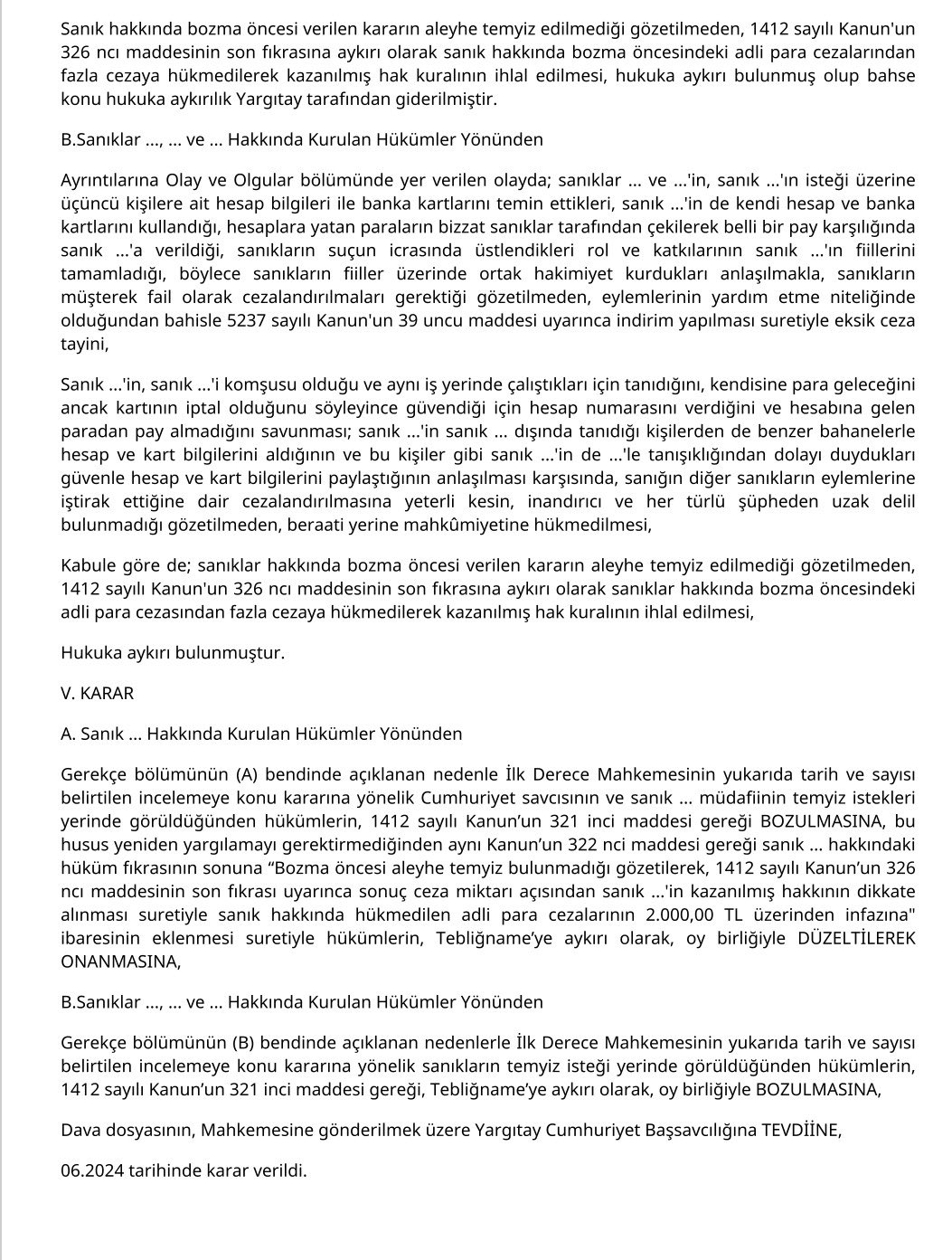 Oca102026Yargıtay KararıYargıtay 11. CD 04.06.2024 Yayın Görüntülemeleri: 102 Ocak 10, 2026 Bu yazıyı paylaş Share on FacebookShare on Facebook TweetShare on Twitter Pin itShare on Pinterest Share on LinkedInShare on LinkedIn Post navigationÖncekiPrevious post:Cinsel suç iddialarının itibar edilebilirliği açısından dikkate alınıp değerlendirilmesi gereken hususlarSonrakiSonraki Yazı:Uyuşturucu Maddelerde Kişisel Kullanım Sınırı Olarak Kabul Edilen Miktarlarİlgili yazılarKiracı evden çıktığında, ödediği depozitonun son kira bedeli olarak güncellenerek iade edilmesi gerekirOcak 10, 2026Uyuşturucu Madde Kullanmada Kamu Davasının Açılmasının Ertelenmesi ve İnfaz DurdurmaOcak 10, 2026Talep artırım dilekçesi verildikten sonra gelen ek rapor doğrultusunda yeniden talep artırım dilekçesi verilebilir.Ocak 10, 2026Adli Arama ve İdari Aramaya İlişkin İçtihatlarOcak 10, 2026Alacaklı, borcun zamanında ödenmemesi nedeniyle enflasyon dolayısıyla uğradığı temerrüdü aşan munzam zararını borçludan talep edebilir.Ocak 10, 2026Alacaklı Takip Konusu Yapmadığı ve Takip Dosyasına Sunmadığı Bir Belgeyi İtirazın Kaldırılması Aşamasında İleri Sürebilir Mi?Ocak 10, 2026